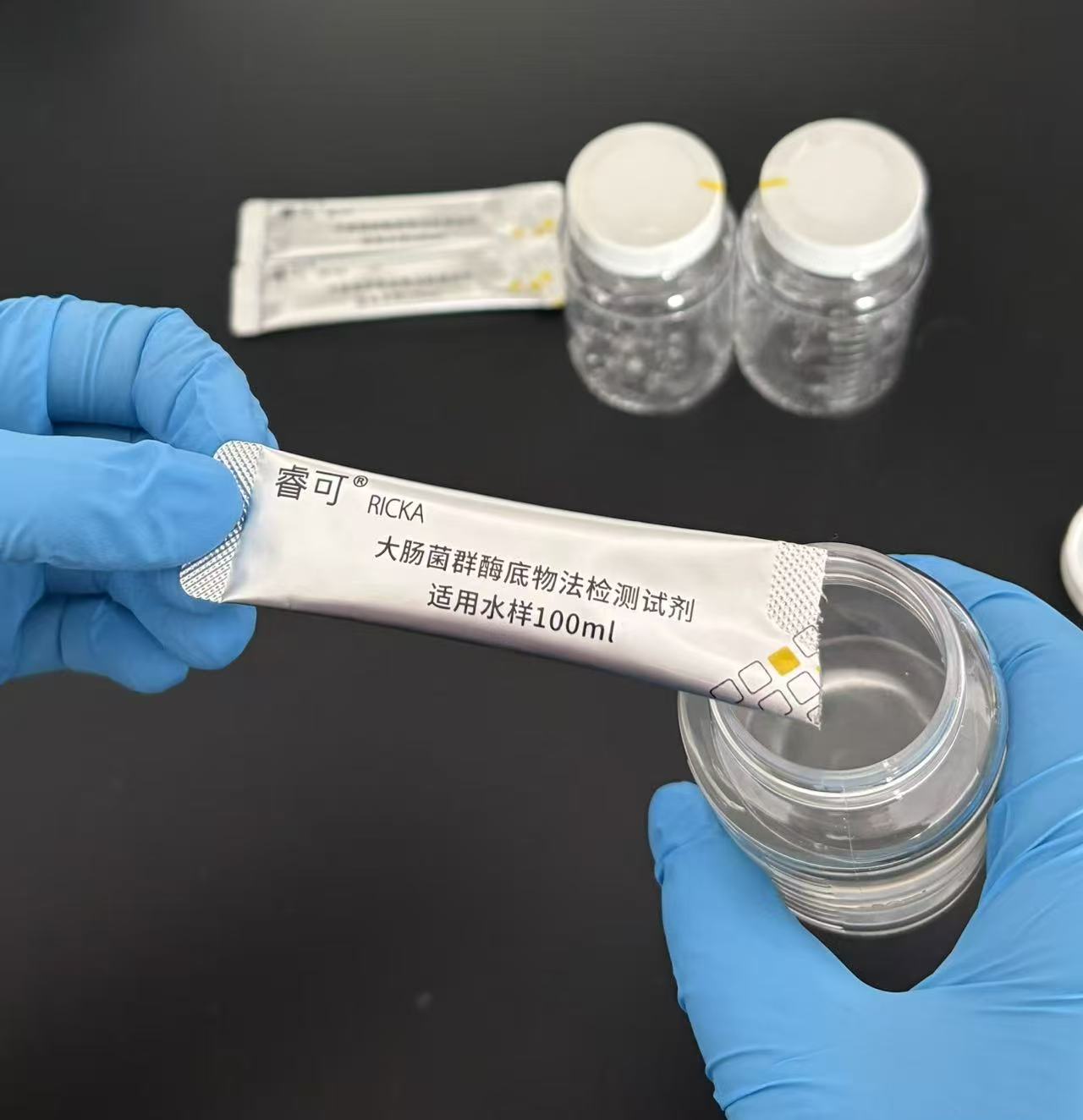 将一个睿可®RICKA大肠检测试剂倒入装有100ml水样的睿可®RICKA无菌取样瓶中,盖上盖子,摇匀。